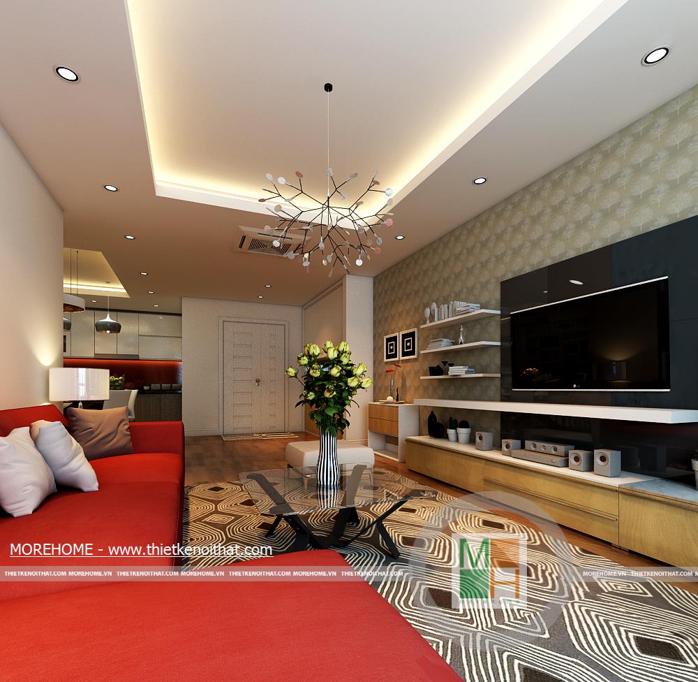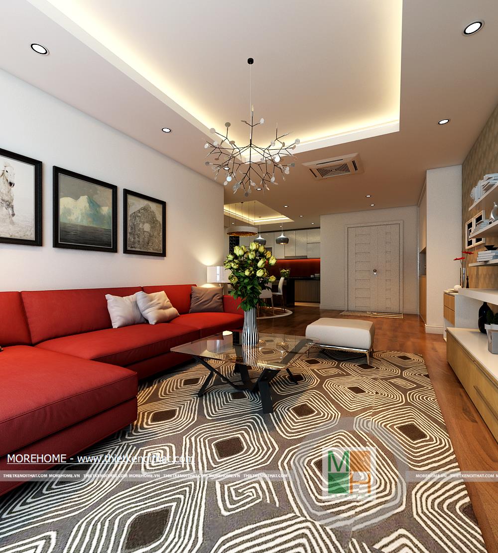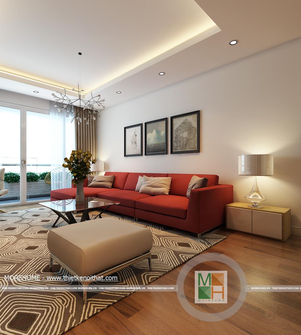 Thiết kế nội thất chung cư theo phong cách hiện đại. Phòng khách được tính toán một cách khoa học, với thiết kế đơn giản gọn gàng với gam màu đỏ của bộ sofa nỉ sang trọng và mang đến cảm giác vô cùng ấm cúng. Bộ sofa với thiết kế vô cùng đơn giản nhưng với tông màu đỏ vô cùng ấn tượng đã đem đến cảm giác sang trọng, hiện đại cho toàn bộ không gian. Chiếc thảm với những chi tiết hình học màu trắng trên nền nâu và những chiếc gối ôm giúp cho không gian thật lịch sự và hiện đại. Sự xuất hiện của chiếc cửa kính lớn giúp không gian phòng khách trở nên rộng rãi và thoáng đãng hơn bao giờ hết. Không gian bên trong và ngoài ngôi nhà như không có vách ngăn. Đồ dùng nội thất được tối giản nhằm tạo ra một không gian noi that phong khach rộng rãi, thoáng đãng và gọn gàng. Nội thất căn phòng được tối giản những vẫn đảm bảo tính tiện nghi cho người sử dụng. Căn phòng thiết kế đề cao sự thoáng mát với việc thiết kế cho ánh sáng tự nhiên vào phòng có ý nghĩa tốt cho việc thư giãn và nghỉ ngơi của quý khách.